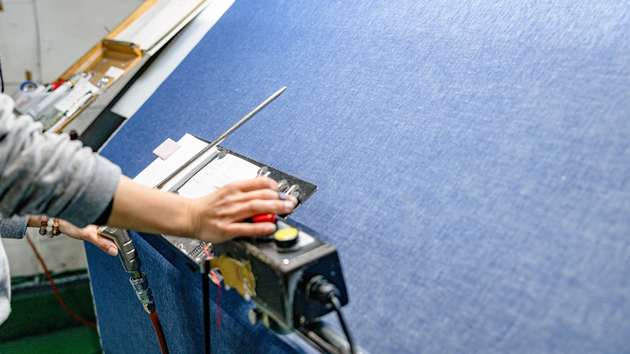 織り上がった生地にキズや不具合がないかを目視で確認します。