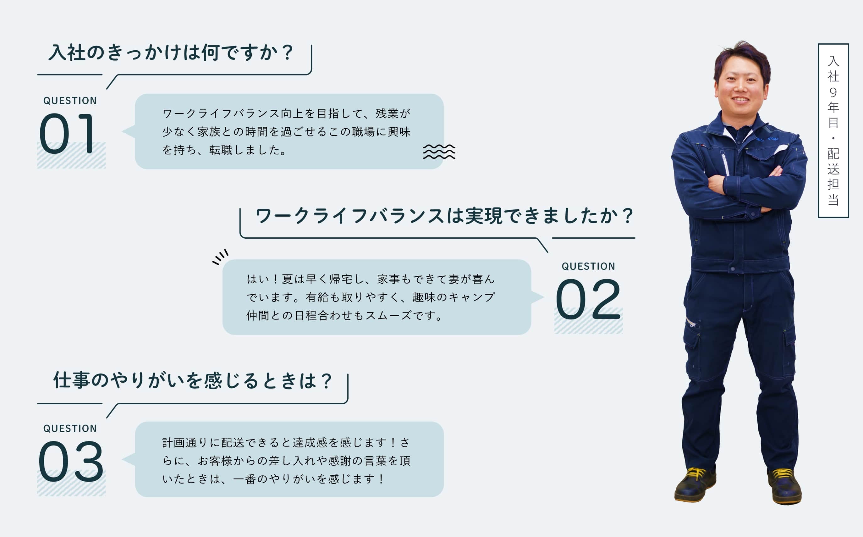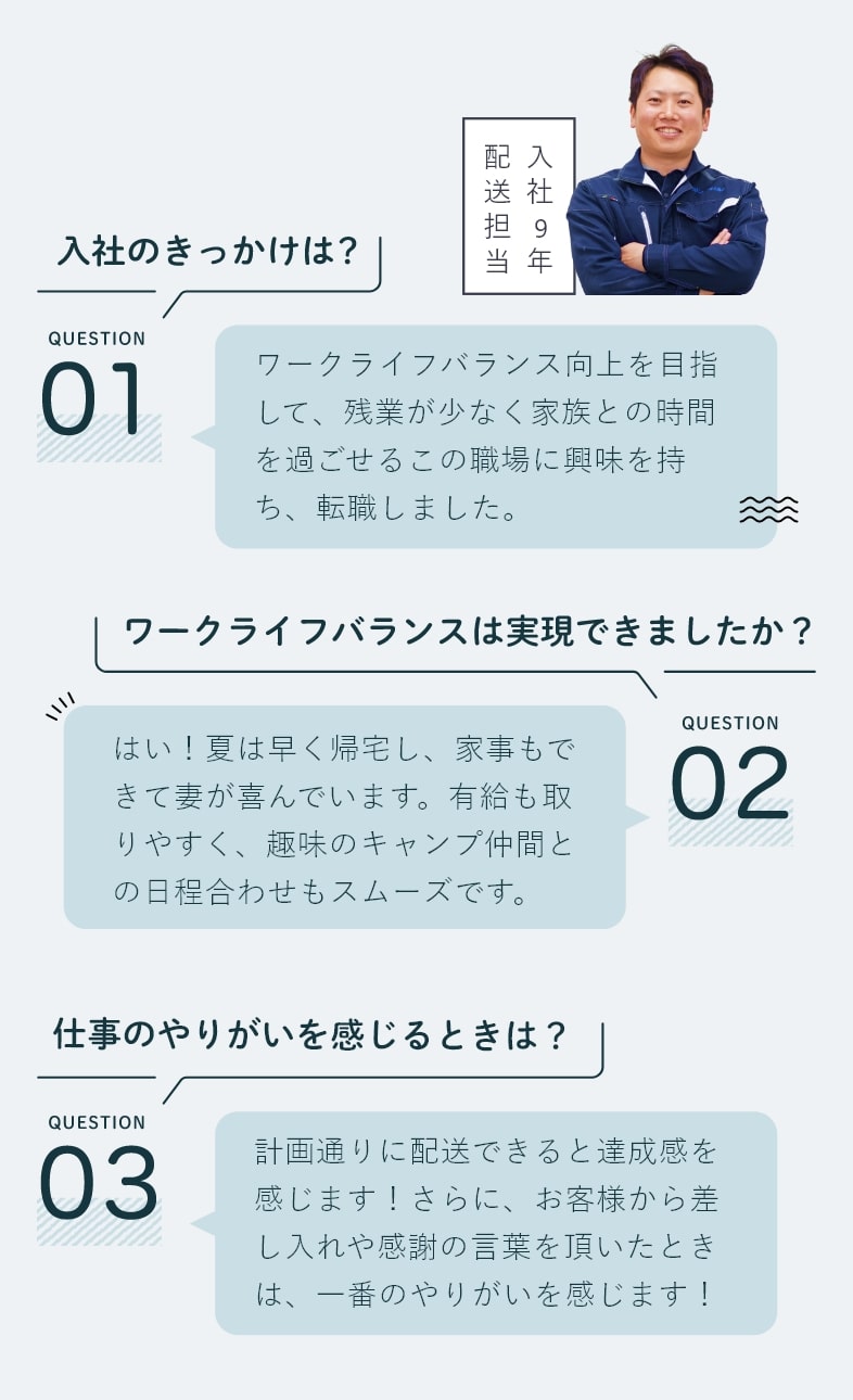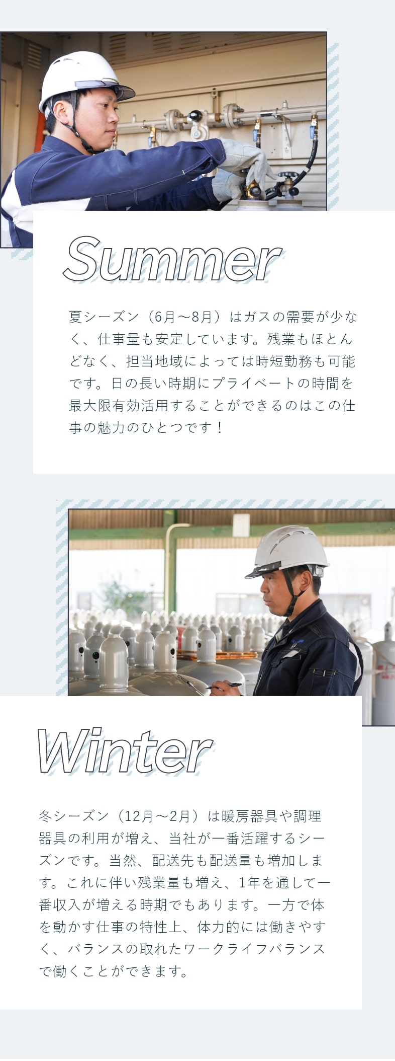 当社の採用サイトをご覧いただきありがとうございます。わたしたちの仕事は、暮らしの便利さや、安全・安心に直結する、とても社会的存在価値の高いものです。一方で特徴ある働き方は一般的に馴染みがないものかもしれません。現在、当社で活躍するスタッフは、特徴ある仕事にやりがいを感じつつ、独自のワークライフバランスを実現しています。平均社歴も長く、「ハマれば長く続けれる仕事」そんな言葉がぴったりの仕事かもしれません。 また社員同士の関係性がよく、ざっくばらんに何でも言い合える、そんな社風も自慢のひとつです。一歩外に出れば1人1人が会社の顔、だからこそ普段からチームワークを大事に、お互いにサポートし合える環境が根付いています。エルピーガス岡山のチームとして、ともに地域社会の発展や安全、安心に貢献できる方をお待ちしています。